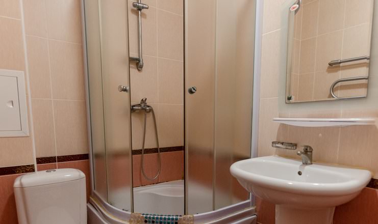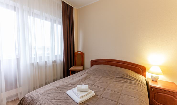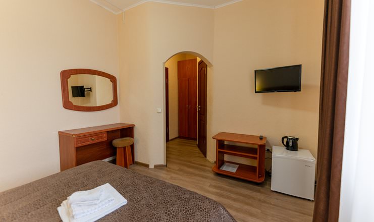 Уютный номер для размещения одного гостя, есть необходимый набор бытовой техники: телевизор, кондиционер, фен.