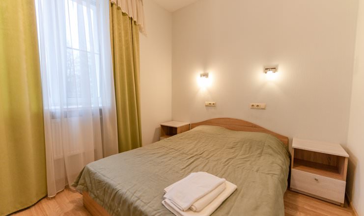Светлый обновленный номер оборудован необходимым набором бытовой техники: чайный набор, телевизор, кондиционер, фен и удобной кроватью для размещения одного гостя.