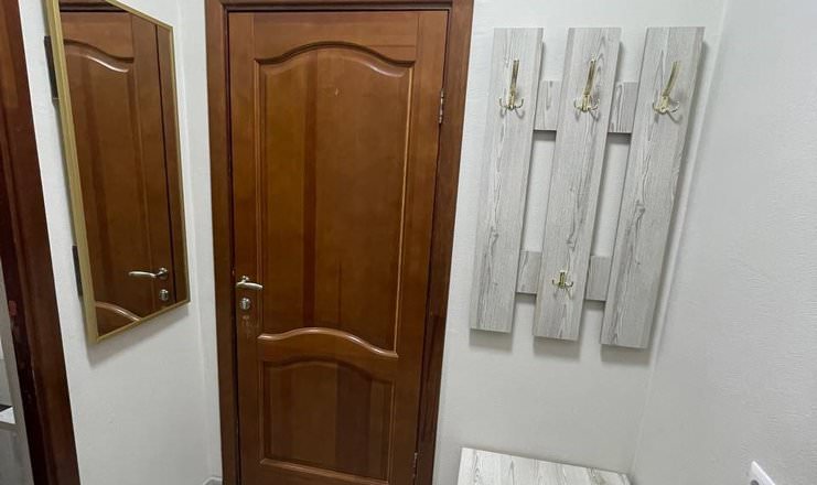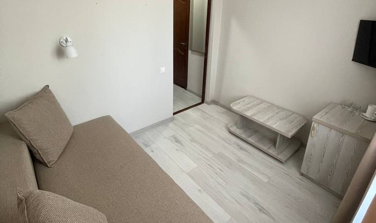 Светлый номер для двоих гостей оборудован большой двухспальной кроватью, есть диван, телевизор, кондиционер и фен.