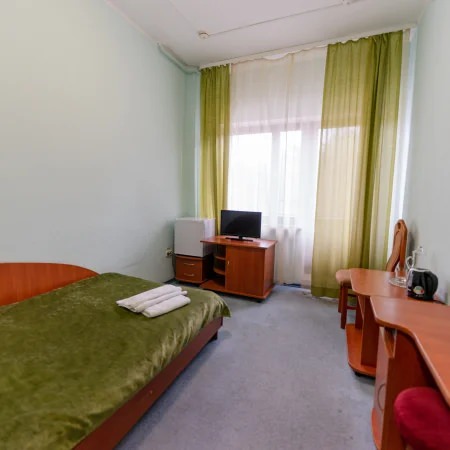 Компактный уютный номер для размещения одного гостя, оборудован кондиционером, телевизором, феном, чайным набором и холодильником.
